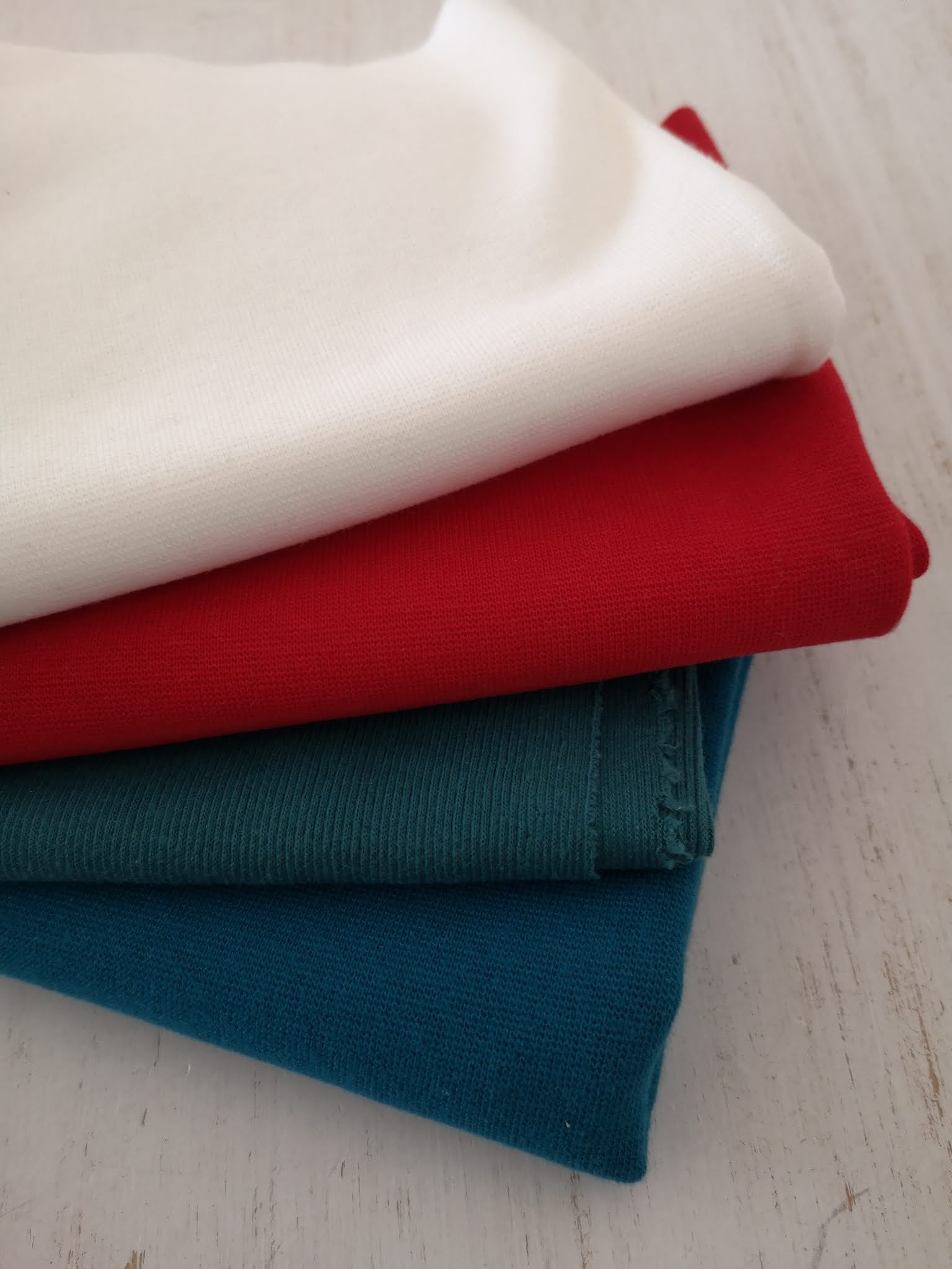 Beide Gewebe sind zu 95 % Bio Baumwolle und 5% Elastan gestrickt und sehr angenehm auf der Haut.